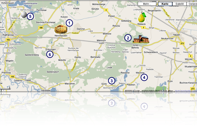 Von Süden: Von der A2 bis Ausfahrt Brandenburg auf die B102. Durch Brandenburg durchwurschteln und auf der B102 in Richtung Rathenow bleiben. In Havelsee die Bundesstr. verlassen und den folgenden Ortschaften auf der Landstraße folgen: Marzahne - Mützlitz - Gräningen - Nennhausen.